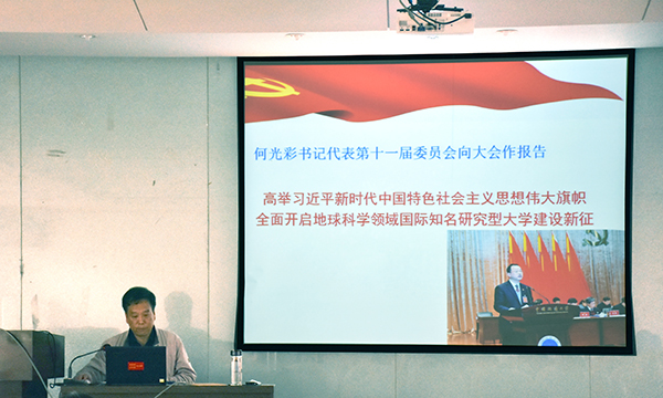 陈飞指出,学校未来发展的宏伟蓝图已经绘就,工程学院“双一流”建设已经启动,全院教职工都要以习近平新时代中国特色社会主义思想为指导,把全面贯彻落实“十九大”精神和学校第十二次党代会精神放在首要位置,切实把思想和认识统一到学校第十二次党代会精神上来,切实把智慧和力量凝聚到实现第十二次党代会提出的奋斗目标任务上来,在学校新一届党委的坚强领导下,以全面加强党的建设为统领,全面落实立德树人根本任务,进一步解放思想、深化综合改革、追求学术卓越,进一步提升教育教学、科学研究、社会服务水平,努力开创各项工作新局面,为把学校建设成为地球科学领域国际知名研究型大学生作出新的更大的贡献。
