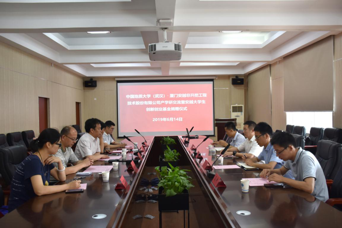 2019年6月14日上午,厦门安越非开挖技术股份有限公司来校作产学研交流,并捐赠10万设立安越大学生创新创业基金,捐赠仪式在315举行。厦门安越非开挖技术股份有限公司董事长廖宝勇一行、武汉中地大非开挖研究院有限公司总经理孔耀祖,校友工作与教育基金管理处副处长吕占峰、丁苗苗,happy漫画 党委书记陈飞、党委副书记江广长、副教授曾聪参加会议。江广长主持会议。