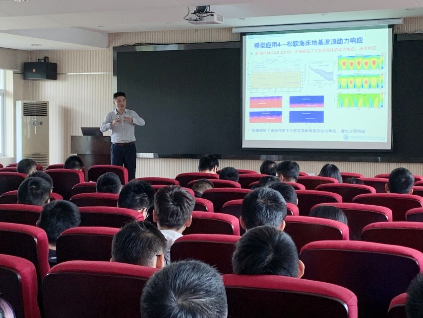 叶剑红研究员以“海洋岩土工程数值分析模型开发与应用”为题,介绍了海洋工程地质与传统工程地质的主要区别,论述了近海环境中海洋极端波浪和地震波研究的重要性。近海结构物在波浪或地震波的作用下容易导致海床地基液化继而造成结构物的失稳。针对近海环境波浪/地震-结构物-海床的协同作用,近海结构物的安全稳定性问题,研发了高可靠度耦合数值计算模型,该模型能够对近海结构物所受波浪或地震引起荷载进行较好模拟。汇报后,叶剑红研究员同与会师生围绕着模型适用性、模型条件等问题进行了深入交流与探讨。