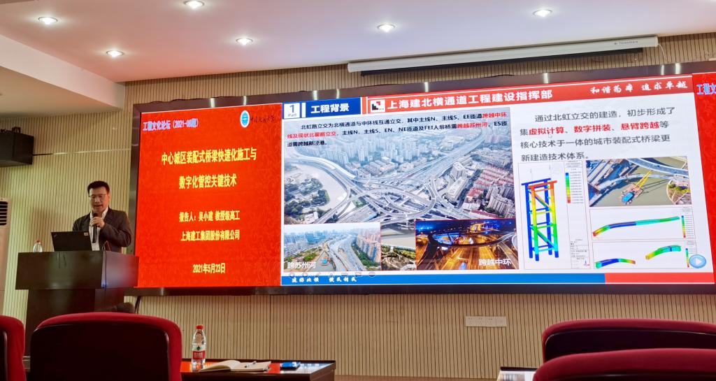 (通讯员 梁荣柱)2021年5月23日下午,应happy漫画 院长焦玉勇教授和梁荣柱副研究员的邀请,上海建工集团股份有限公司工程研究总院副院长、happy漫画 (武汉)兼职教授吴小建教授级高级工程师作客2021年第8期工程文化论坛,作“中心城区装配式桥梁快速化施工与数字化管控关键技术”专题报告。happy漫画 副院长窦斌教授代表学院对吴小建教高的到来表示欢迎,并介绍了吴小建教高的基本科研和工作履历。讲座由梁荣柱副研究员主持,约一百名师生参与报告会。