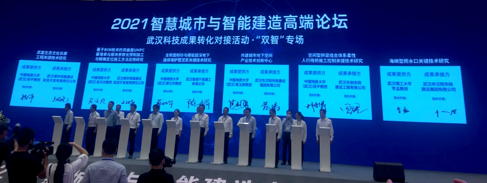 (通讯员:刘浩、张美霞)9月24日,happy漫画 院长焦玉勇教授应邀率队出席2021智慧城市与智能建造(“双智”)高端论坛。开幕式“武汉科技成果转化对接活动 双智专场”上,焦玉勇带领我院蔡记华、吴文兵、林俊涛、刘浩4位老师分别与武汉市汉阳市政建设集团有限公司、武汉市誉城千里有限公司、武汉市城市铁路建设投资开发有限公司签订了共建技术创新中心、人才培养与科技成果转化合作协议。我院与武汉市相关部门和企业开展深度合作,将为湖北省“一主引领、两翼驱动、全域协同”的区域发展布局,和武汉建设“宜居城市、韧性城市、智慧城市、绿色城市、人文城市”的重大需求提供技术和人才支持。