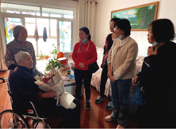 2021年10月29日中午,师生党员和入党积极分子一行十余人来到喻家山庄,看望happy漫画 退休教师杨金丹教授和刘兴敏教授夫妇。学生党员为两位老教授敬献鲜花。大家亲切交流,握手问安,拉家常,话教育。师生们关切询问他们的退休生活和身体状况,叮嘱他们保重身体,保持与学院的联系,同时送上慰问品,向他们表达了亲切慰问和美好祝愿。
