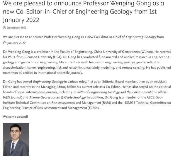 (通讯员:黄静)近日,happy漫画 龚文平教授受邀担任国际期刊Engineering Geology共同主编(Co-Editor-in-Chief)。龚文平教授的此次任职将有助于促进我校在工程地质相关领域与国内外学者的交流合作,并提升我校在工程地质相关领域的国际影响力。