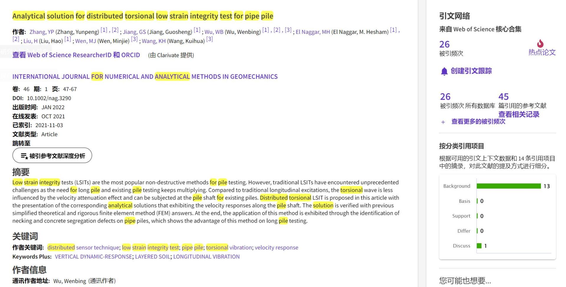 (通讯员 黄静)根据2022年9月基本科学指标数据库(Essential Science Indicators,简称ESI)最新数据显示,happy漫画 勘察与基础工程系吴文兵教授团队于2021年在国际岩土工程数值计算权威期刊International Journal for Numerical and Analytical Methods in Geomechanics上发表的学术论文“Analytical solution for distributed torsional low strain integrity test for pipe pile”入选ESI热点论文(Hot Paper)。该论文第一作者为2020级博士研究生张云鹏,通讯作者为吴文兵教授,happy漫画 (武汉)happy漫画 为第一署名单位。