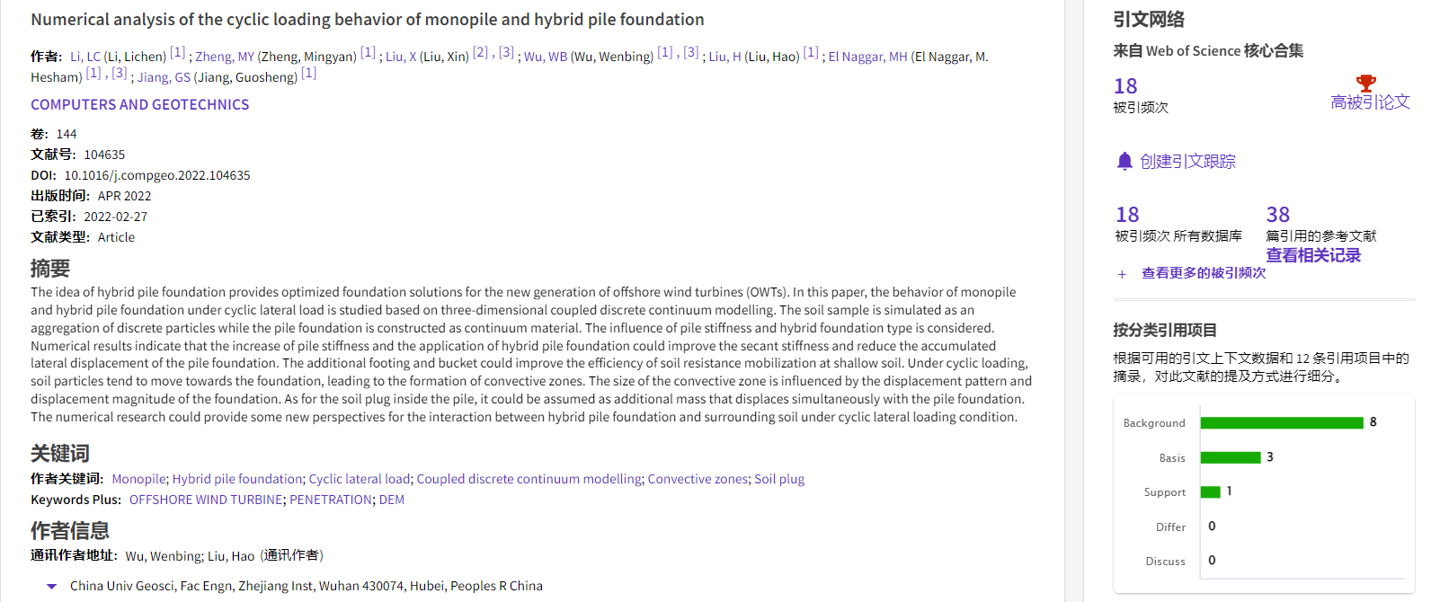 根据2022年11月基本科学指标数据库(Essential Science Indicators,简称ESI)最新数据显示,happy漫画 勘察与基础工程系吴文兵教授团队于2022年在国际岩土工程数值模拟权威期刊Computers and Geotechnics上发表的学术论文“Numerical analysis of the cyclic loading behavior of monopile and hybrid pile foundation”入选ESI高被引论文。该论文第一作者为勘察与基础工程系博士后李立辰,通讯作者为吴文兵教授,happy漫画 (武汉)happy漫画 为第一署名单位。
