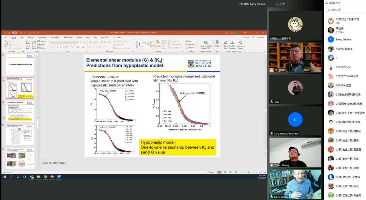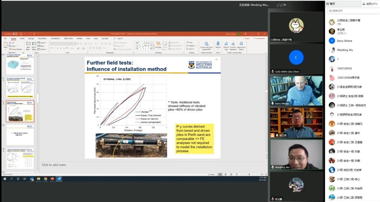 报告结束后,来自中国海洋大学的王栋教授,东南大学的张友虎教授以及happy漫画 博士生陈力博、张云鹏等师生与Barry Lehane教授进行了精彩的讨论。最后,happy漫画 吴文兵教授对此次学术活动进行了总结,并真诚期盼西澳大学与happy漫画 (武汉)能进行更多的交流与合作。
