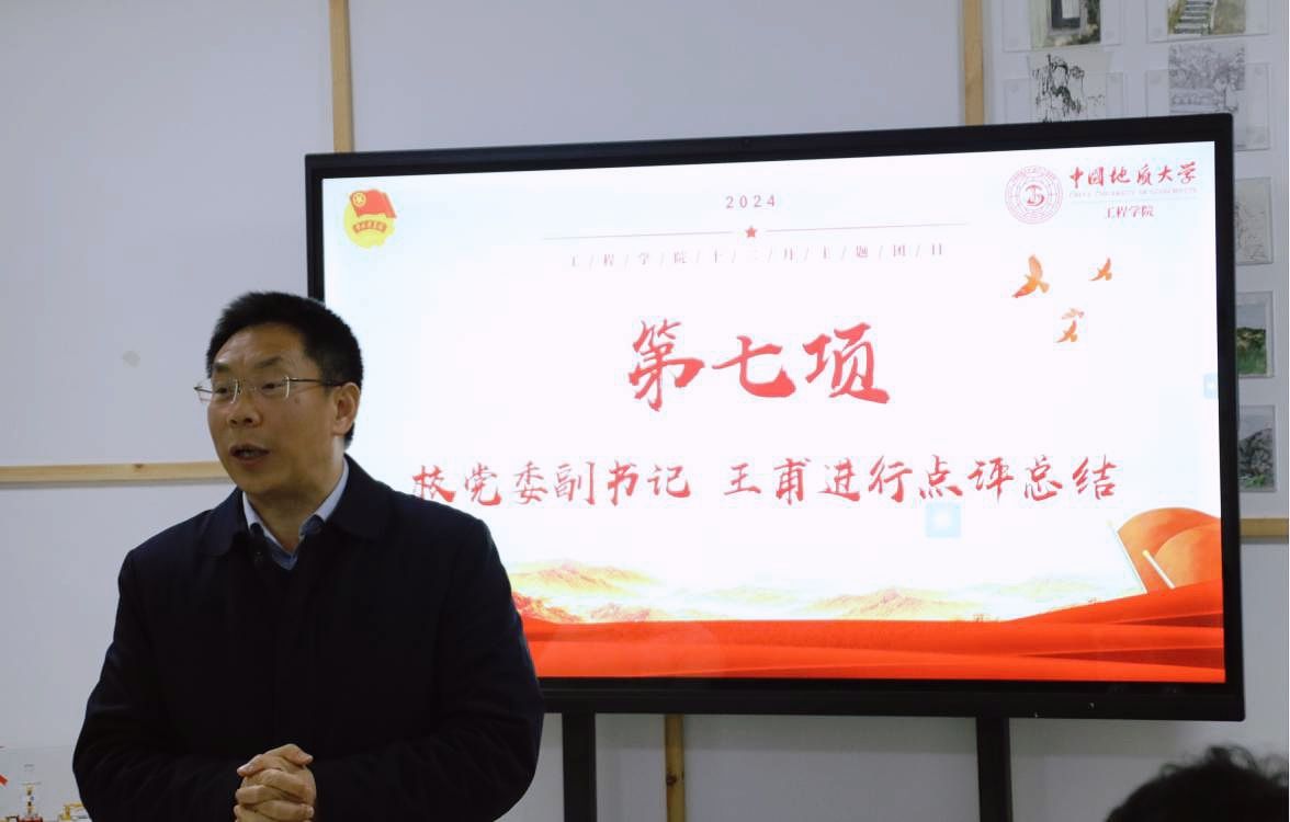校党委副书记王甫点评总结。他表示,工程学院将大洋钻探船“梦想”号重要子系统建造者们请进主题团日活动,让同学们零距离接触、聆听、问询青年师生投身重大工程建设的生动故事和鲜活经验,是一种极为宝贵且行之有效的育人方式,既为同学们了解“梦想”号提供了重要渠道,也为学生团支部开展主题团日活动提供借鉴。他指出,学校人才培养单位要注重运用新时代伟大变革成功案例开展思想政治教育,积极从与本学科专业相关的大国工程、大国工匠、大国重器中寻找思政教育力量,不断拓展实践育人和网络育人的空间和阵地;要注重挖掘学校学院独有的教育资源和生动元素开展思想政治教育,积极把校训精神、南迁办学精神、攀登精神、摇篮精神等育人资源整合,发挥思想引领作用,让广大青年团员感受思想伟力;要注重用好专家教授开展教学科研的典型事迹开展思想政治教育,充分认识到“每一项伟大事业背后都有无数个感人的故事”,要把这些故事讲生动、讲活泼、讲进学生心里,在故事中教育人、塑造人、引导学生成就精彩人生。最后,他希望全体工程学子树立正确价值观和人生信念,将个人的理想融入党和国家事业当中,立报国强国大志向,做挺膺担当奋斗者,在推进强国建设、民族复兴伟业的奋进之路上勇敢向前。