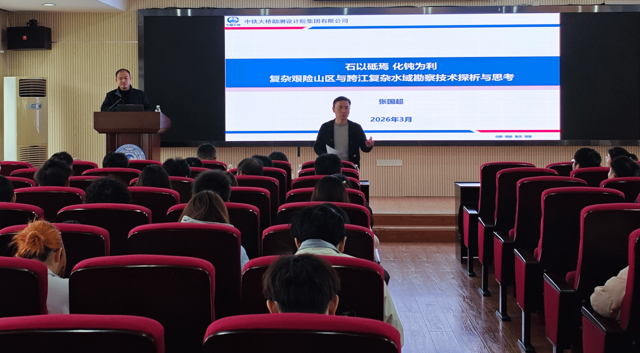 张国超正高级工程师的学术报告题目为“石以砥焉,化钝为利:复杂艰险山区与跨江复杂水域勘察技术探析与思考”。他以高原铁路金沙江特大桥、赤壁长江公路大桥、海太长江隧道等重大工程项目勘察实践为基础,结合自身一线工作成长经历,深入剖析了复杂艰险山区与跨江复杂水域场景下工程勘察的重点、难点及相应解决方案。立足于当前人工智能快速发展的时代背景,他阐述了野外踏勘工作不可替代的重要性,凸显了地质工作者深耕一线的宝贵品质。同时,结合现实工作中所遇到的各种困难,他强调了坚定信念的重要作用,并分享了依托优质平台与高效团队推动个人成长与工程实践的宝贵经验。最后,他结合实际项目经验,阐明了工程实践与科学研究之间是相辅相成、相互成就的关系,鼓励同学们要研究落地,服务社会。