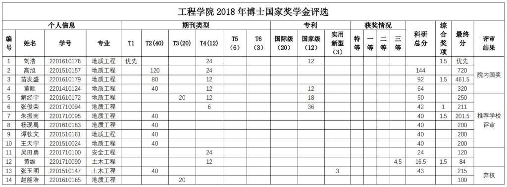 经个人申报,学院研究生国家奖学金评审委员会秘书处资格审查,学院研究生国家奖学金评审委员会于2018年9月29日下午组织通过资格审查的申报者(其中博士研究生14人,硕士研究生17人)进行答辩评审,学院研究生国家奖学金监审委员会全程监督。会议确定了刘昌坤等8名硕士研究生,刘浩等4名博士研究生为工程学院2018 年研究生国奖学金候选人。现将工程学院 2018 年国家奖学金候选人公示(见下表)。
