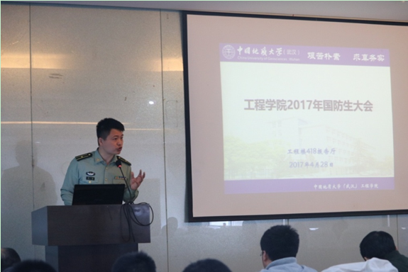 (通讯员:文新)4月28日上午,工程学院2017年国防生大会在工程楼418报告厅召开。院党委副书记江广长,校国防办主任李凛,驻校选培办干事谭皓,辅导员丁继国、文新、王俊以及学院全体国防生参加了大会。
