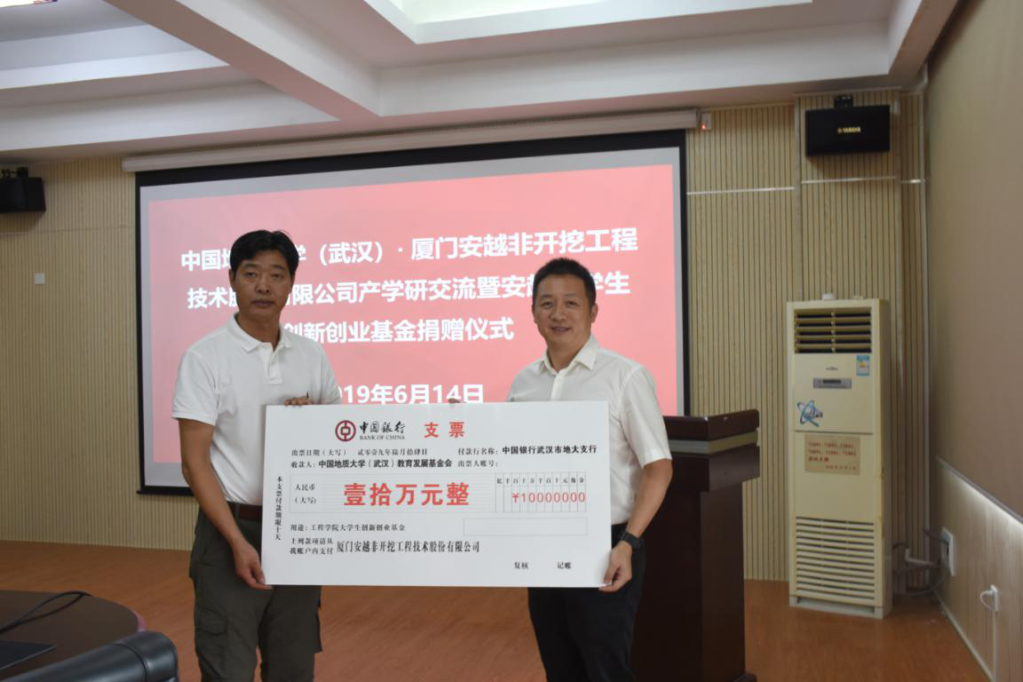 2019年6月14日上午,厦门安越非开挖技术股份有限公司来校作产学研交流,并捐赠10万设立安越大学生创新创业基金,捐赠仪式在315举行。厦门安越非开挖技术股份有限公司董事长廖宝勇一行、武汉中地大非开挖研究院有限公司总经理孔耀祖,校友工作与教育基金管理处副处长吕占峰、丁苗苗,工程学院党委书记陈飞、党委副书记江广长、副教授曾聪参加会议。江广长主持会议。