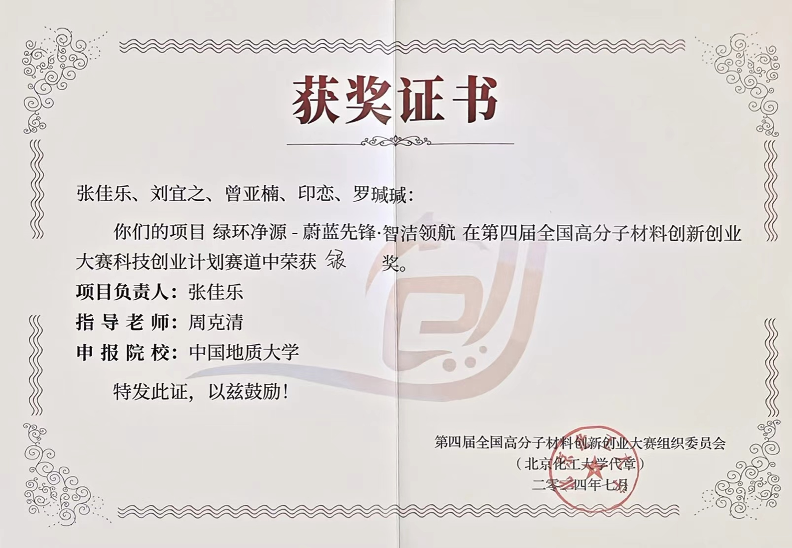 周克清特任教授指导的《绿环净源-蔚蓝先锋·智洁领航》项目荣获第四届全国高分子材料创新创业大赛科技创业计划赛道银奖。项目团队成员包括工程学院安全工程系本科生张佳乐、刘宜之、博士研究生生印恋、罗瑊瑊和马克思主义学院本科生曾亚楠。
