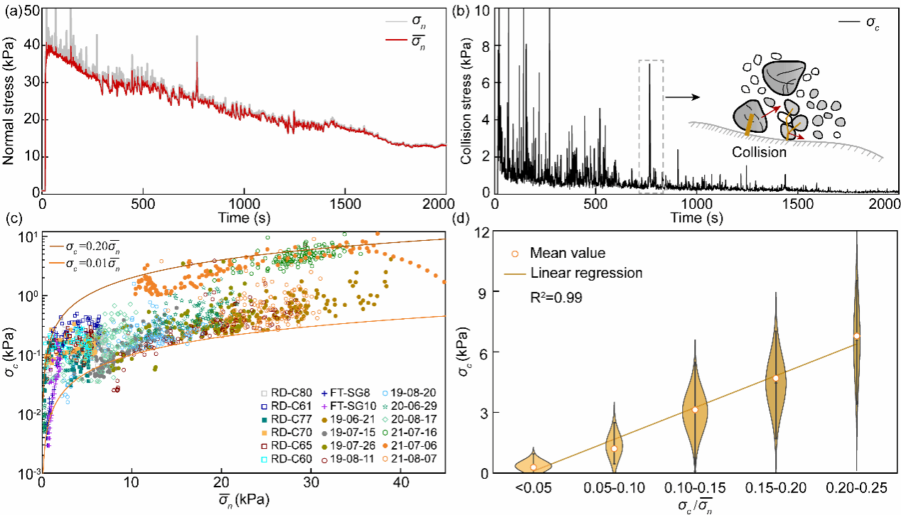 针对这一问题,郑鸿超特任教授基于Coulomb准则建立了考虑基底剪应力、碰撞应力和基床孔隙流体压力发展的泥石流侵蚀力学模型,并通过室内试验和Illgraben流域实测数据验证了该模型的有效性。结果表明:(1)对于潮湿沟床,由于高孔隙流体压力的发展,基底剪切和碰撞应力共同控制着泥沙侵蚀;对于干燥沟床,仅碰撞应力对泥沙侵蚀起控制作用,根本原因在于基底剪应力不足以克服剪切阻力;(2)对于剪切驱动的侵蚀沟床,孔隙流体压力通过降低剪切阻力促进侵蚀;对于碰撞驱动的侵蚀沟床,孔隙流体压力则通过增加其劈裂深度促进侵蚀。