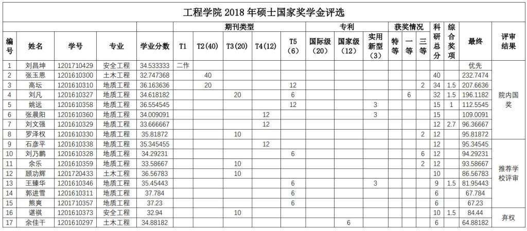 经个人申报,学院研究生国家奖学金评审委员会秘书处资格审查,学院研究生国家奖学金评审委员会于2018年9月29日下午组织通过资格审查的申报者(其中博士研究生14人,硕士研究生17人)进行答辩评审,学院研究生国家奖学金监审委员会全程监督。会议确定了刘昌坤等8名硕士研究生,刘浩等4名博士研究生为工程学院2018 年研究生国奖学金候选人。现将工程学院 2018 年国家奖学金候选人公示(见下表)。