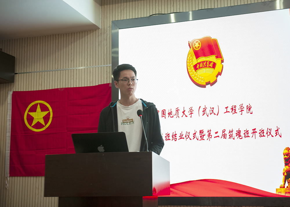学员代表朱豪豪发言,他说工程学院创办的筑魂班是同学们学习成长的舞台,大家应当在这个平台上努力成长,最终成为社会主义现代化建设中的中坚力量。他呼吁同学们努力学习,发挥榜样的力量,应对时代挑战。